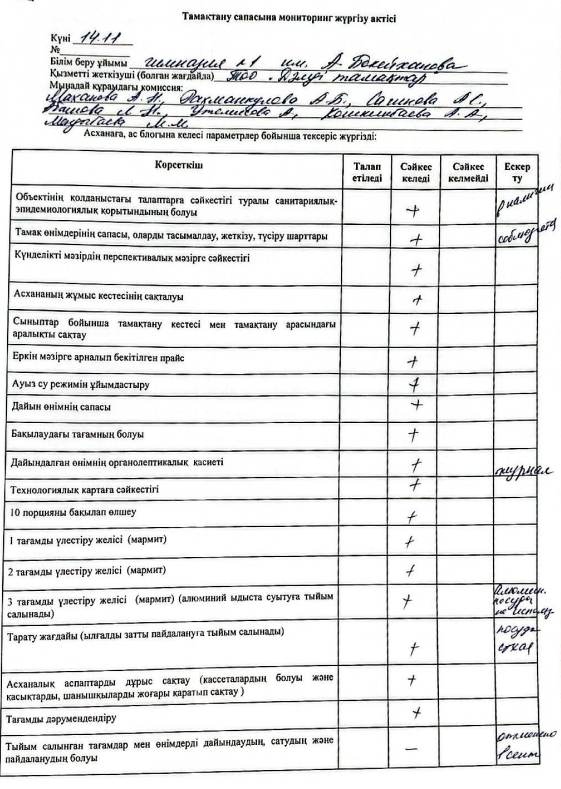 » Тамақтану сапасына мониторинг жүргізу актісі