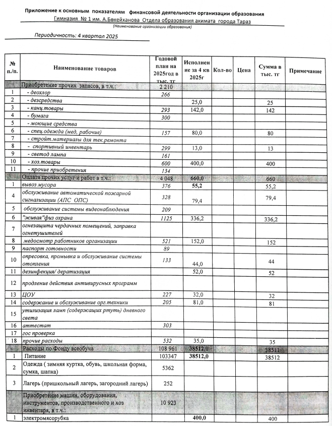 23 қаңтар 2026 0 1 2 3 4 5 Приложение к основным показателям финансовой деятельности организации образования. Периодичность: 4 квартал 2025 г